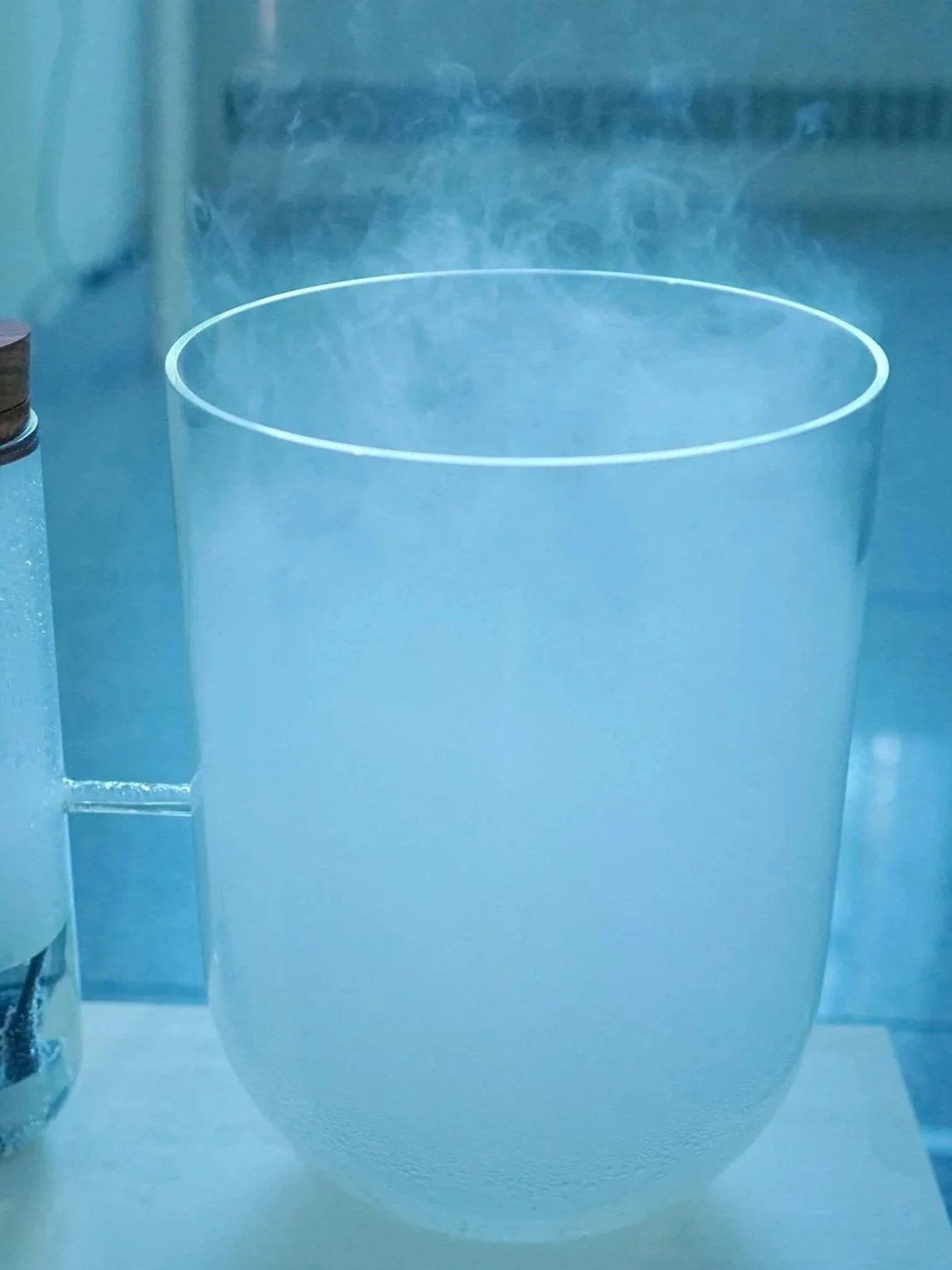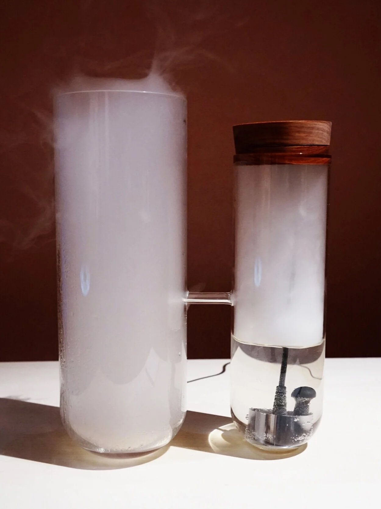 これは雲のインスタレーションです。人の動きや空気の揺らぎによってガラス管の中に対流が起こりは雲のように揺らぎ拡散します。一つは霧を発生させ、一つは霧を緩やかに溜め込み空間を加湿します。
